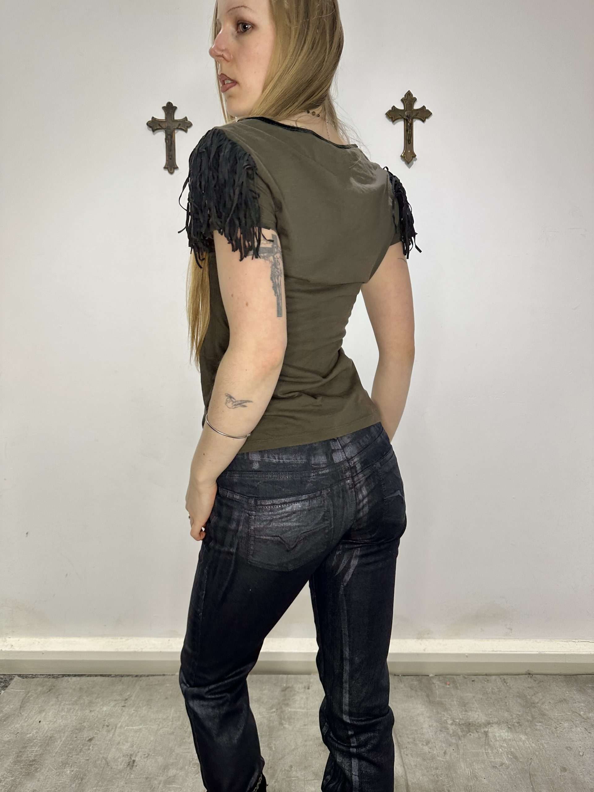 sexy indie sleaze suede fringe shoulder detail logo tee by miss sixty