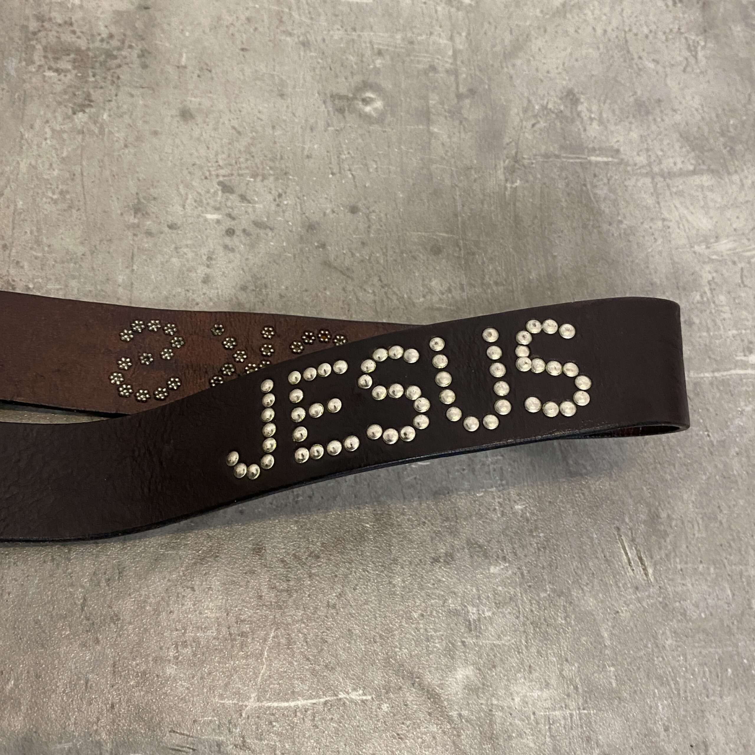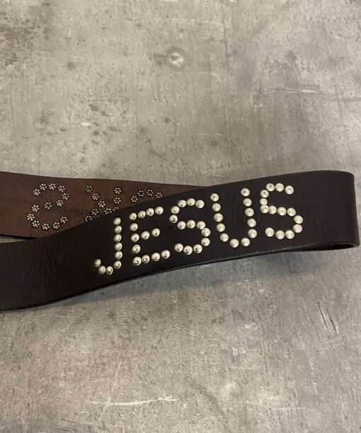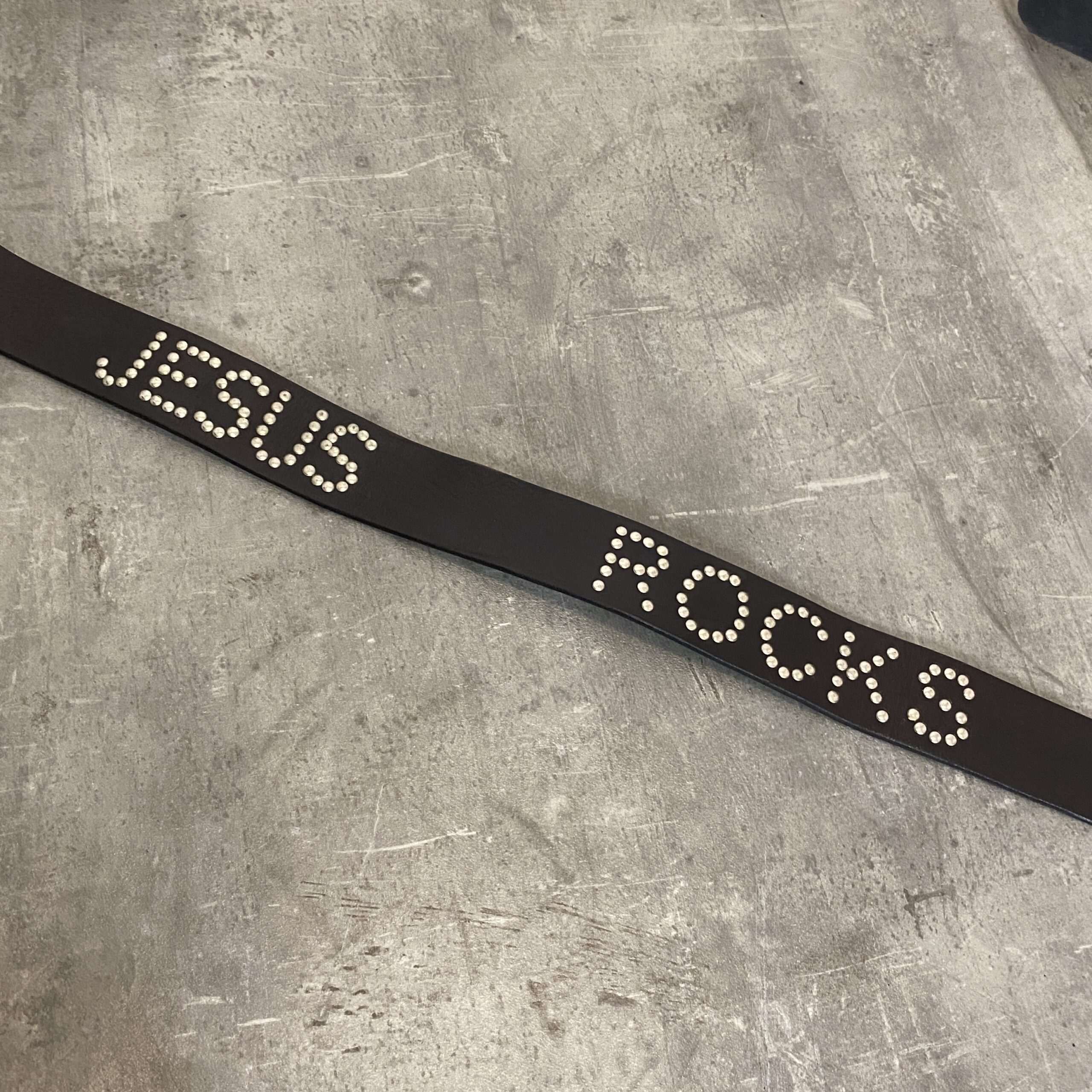- amazing studded leather belt which says ‘jesus rocks’ so iconic