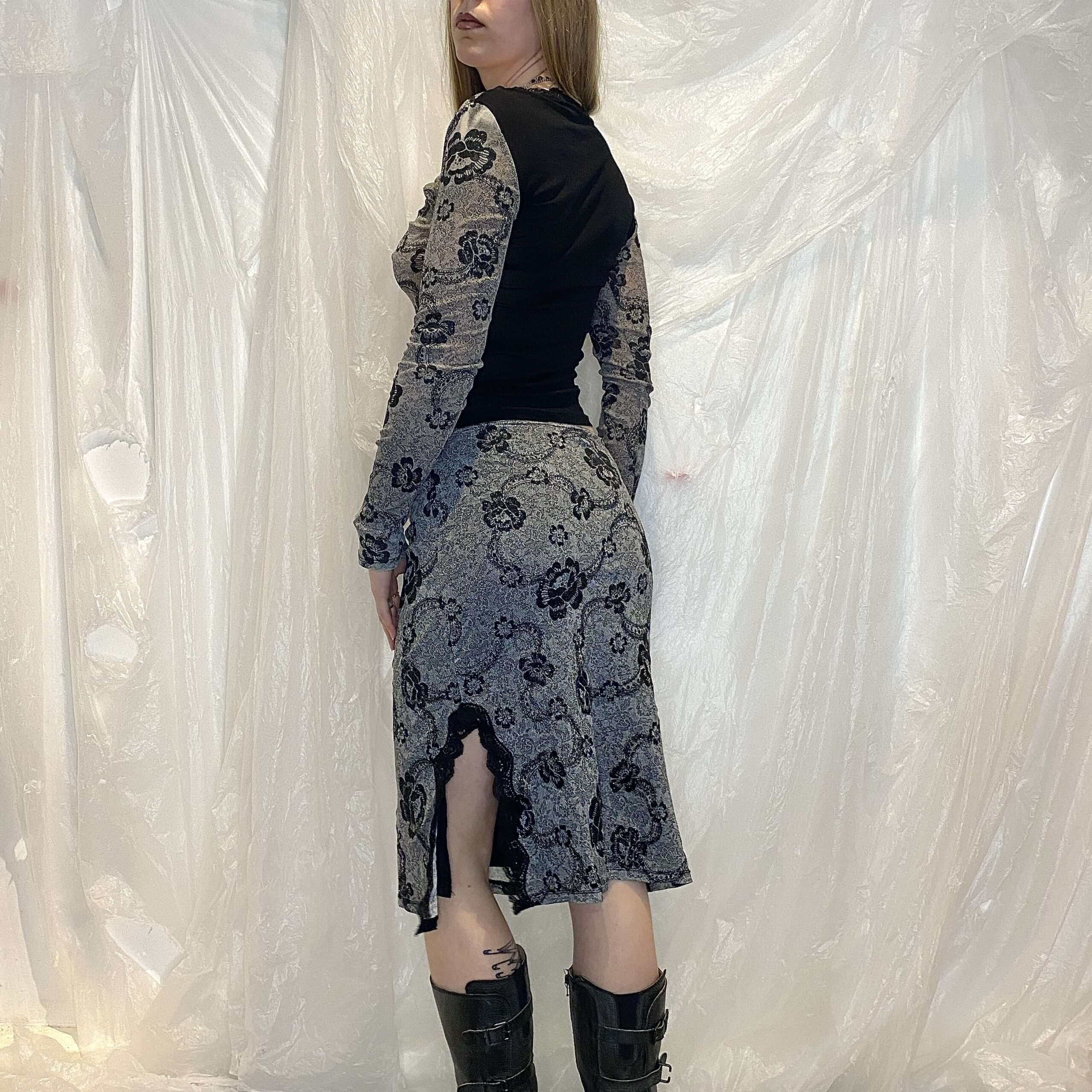 incredible coquette vintage lace trim graphic print v neck long sleeve top with matching midi skirt with lace trim…such a flattering and amazing set. literally 3 outfits in one which can be dressed up or down